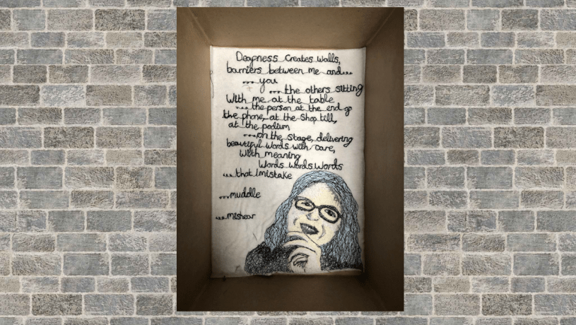 Featured image: Deafness creates walls by Emily Chapman. My daughter created this piece of textile art, using some of the words I had used to describe my experiences of deafness. The original is set within a deep box.